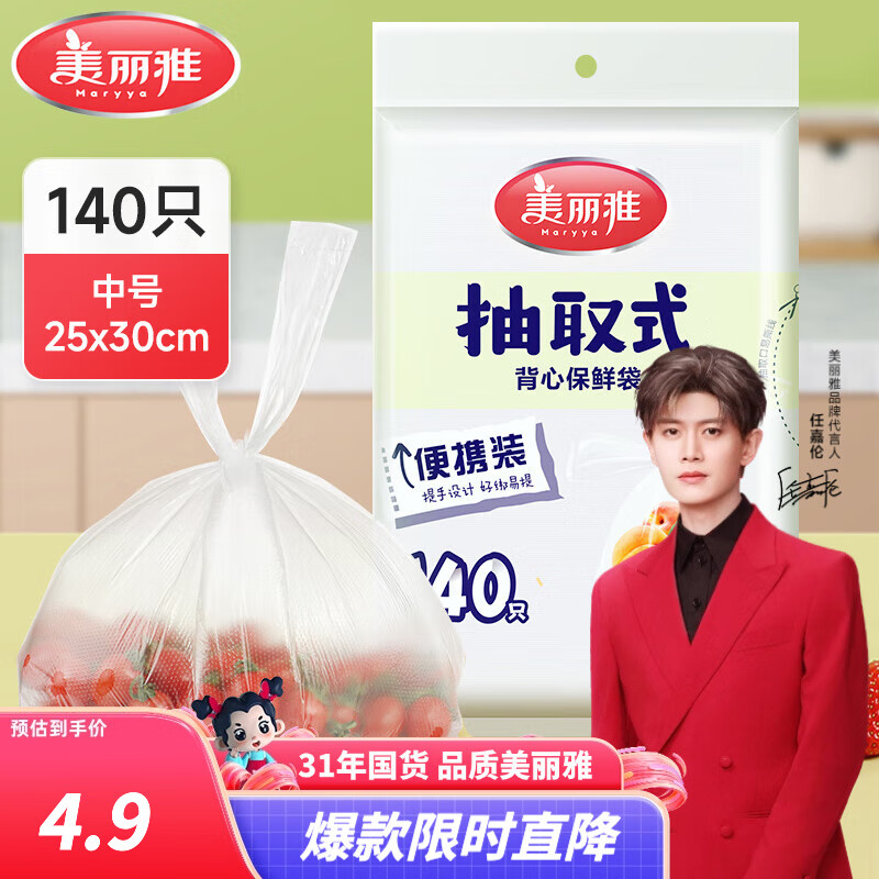 美丽雅保鲜袋食品级塑料袋 PE保鲜袋食品袋加厚免撕一次性厨房包装袋 【背心款】抽取式 中号-140只