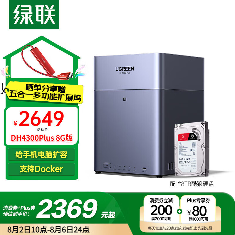 绿联私有云DH4300Plus 8T四盘位NAS网络存储个人云家庭硬盘服务器手机NFC一碰连接AI相册手机平板扩容