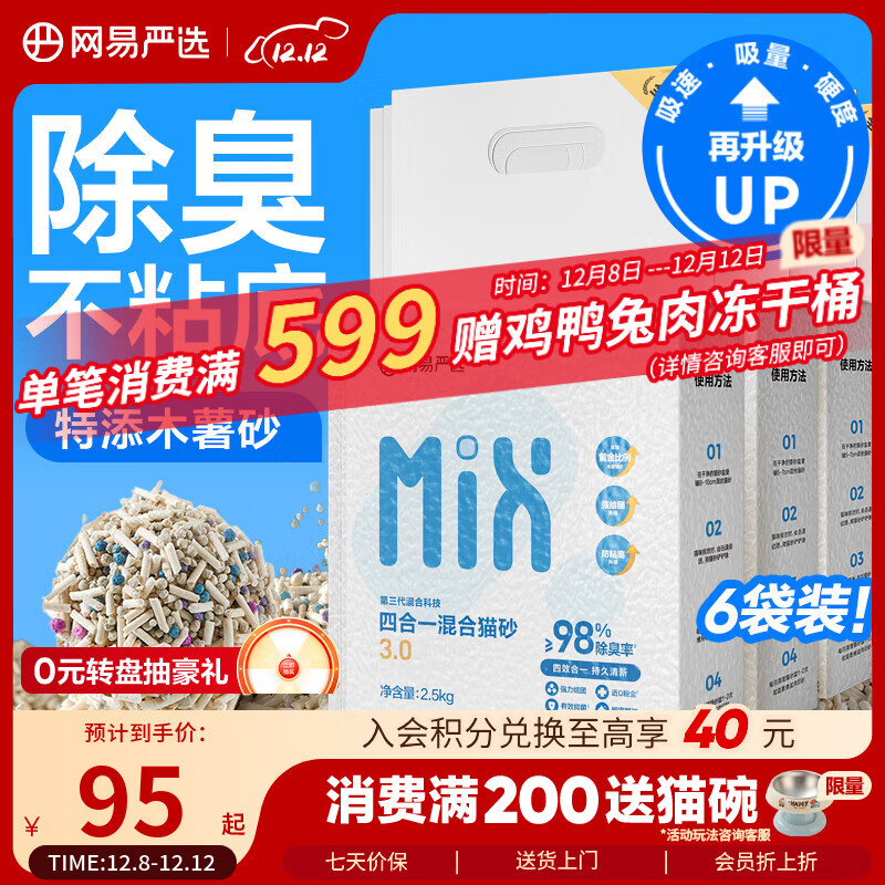 网易严选四合一豆腐膨润土植物混合猫砂结团不沾底除臭木薯猫砂 2.5kg*6包