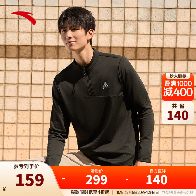 安踏羊毛T丨美利奴羊毛长袖t恤男秋冬新款半开襟户外透气徒步上衣 基础黑-2 L (男175)