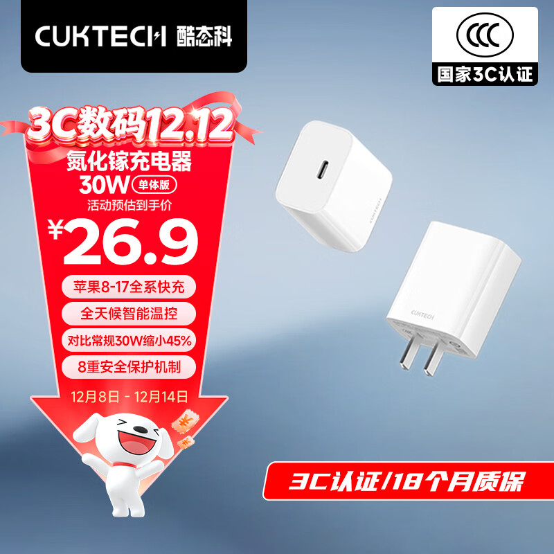CUKTECH酷态科苹果17充电器PD30W氮化镓快充套装适用iPhone17/16/15promax/Air手机小米华为type-c插头
