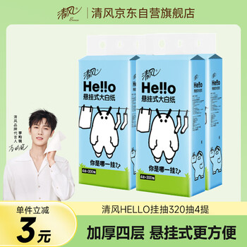 清风(APP)【李昀锐同款】hello挂抽 面巾纸 悬挂式4层300抽*4提 厕纸卫生纸