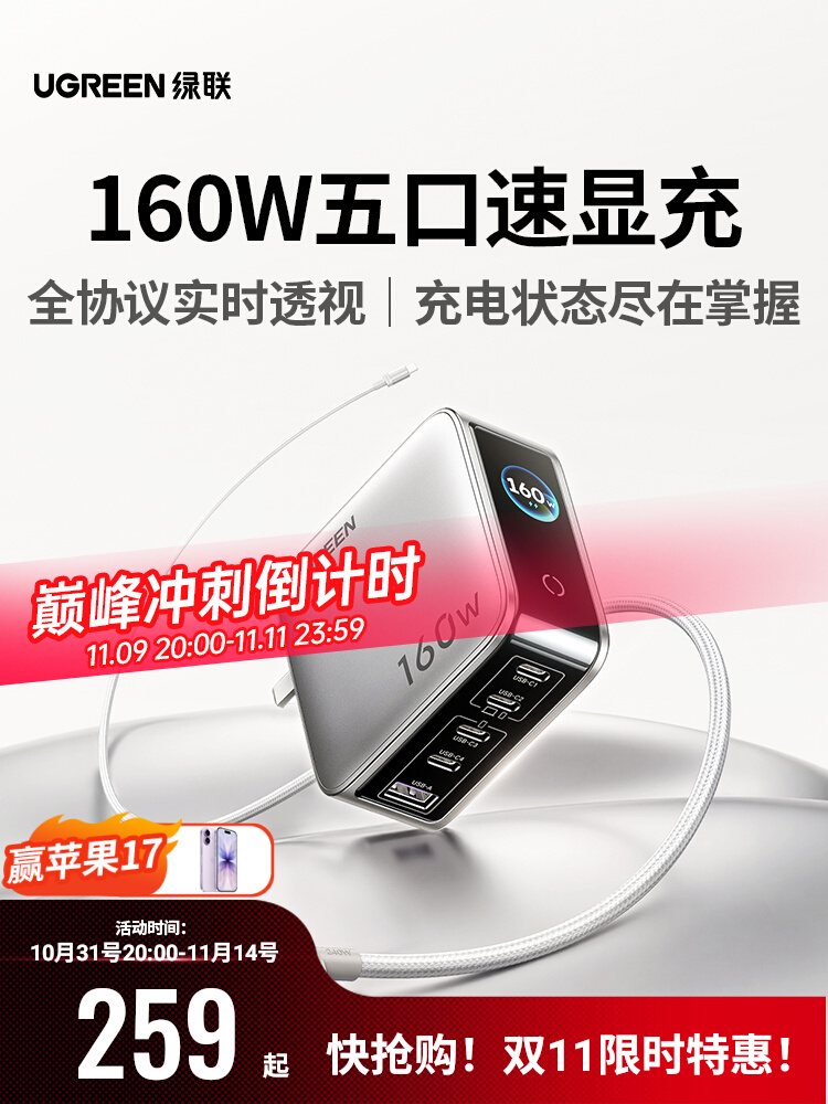 绿联速显充160W氮化镓充电器头PD3.1快充头适用苹果iPhone17小米华为MacBook笔记本电脑手机平板140W多口插头