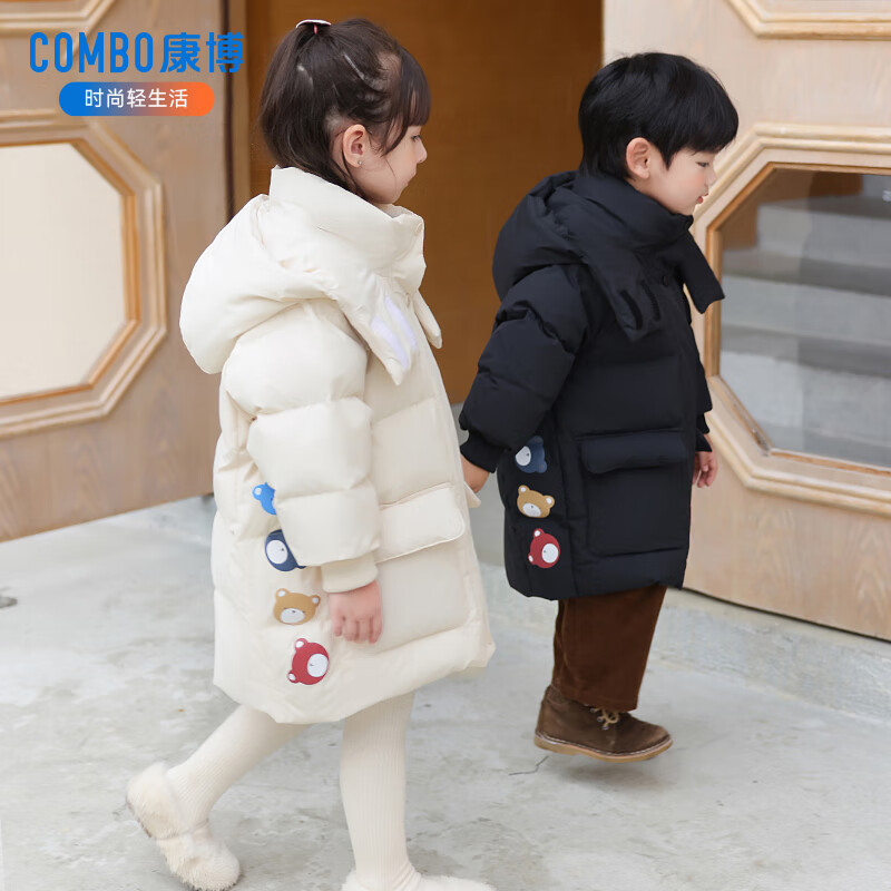 康博男童女童羽绒服宝宝中长款新款洋气加厚冬季儿童保暖外套 米色888 120