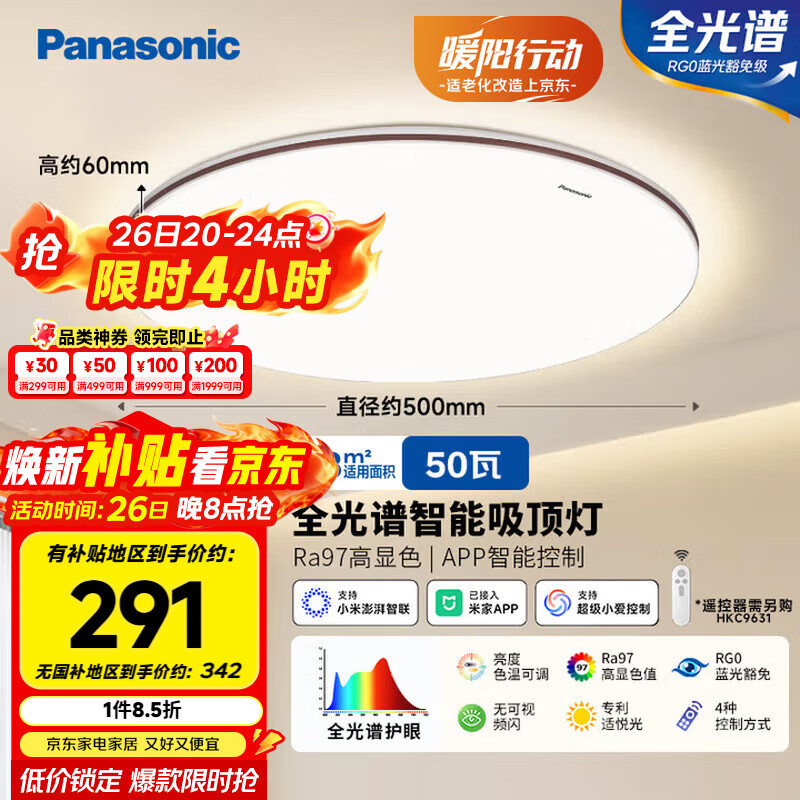 松下(Panasonic)吸顶灯卧室灯全光谱护眼银色简约款50瓦 HHXQ5160【包安装】