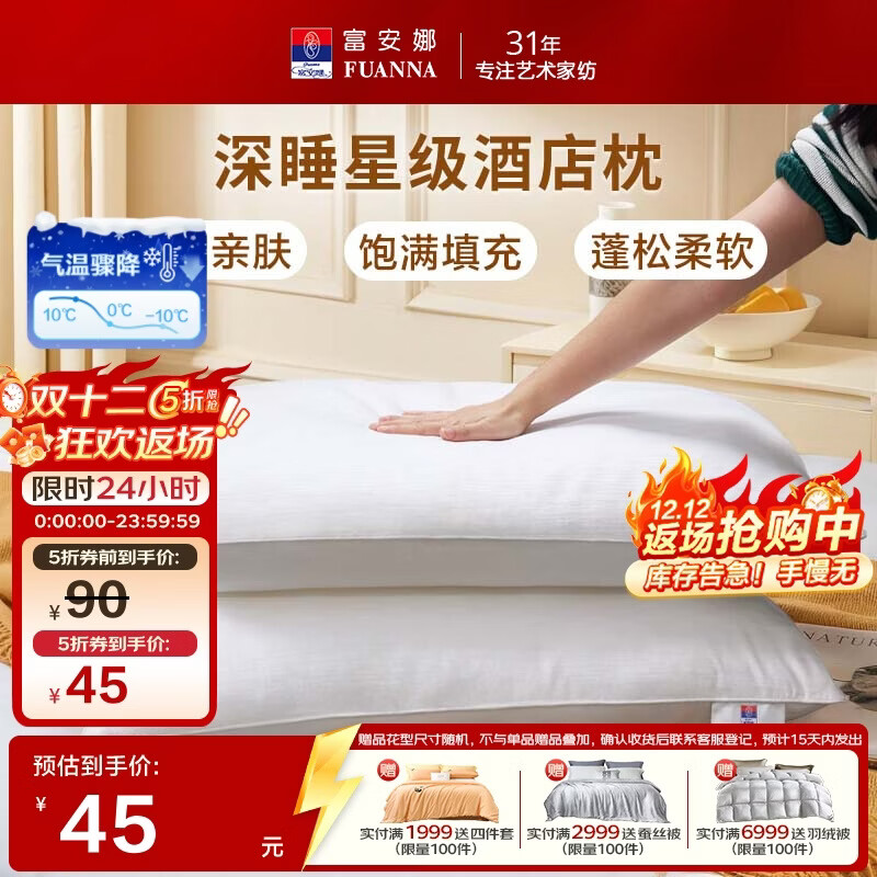 富安娜枕头芯纯棉面料成人枕酒店枕芯纤维软枕 中枕一个装74*48cm