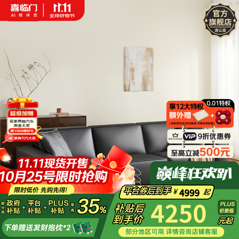 喜临门皮艺沙发客厅现代简约真皮进口头层牛皮直排小户型大黑牛 静谧黑-三人位-310cm大坐宽