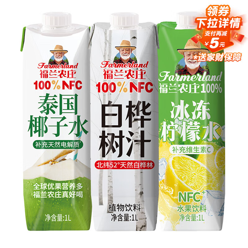 福兰农庄0脂肪果汁饮料补维C1L*3瓶(1瓶椰子水+1瓶白桦树汁+1瓶柠檬水)
