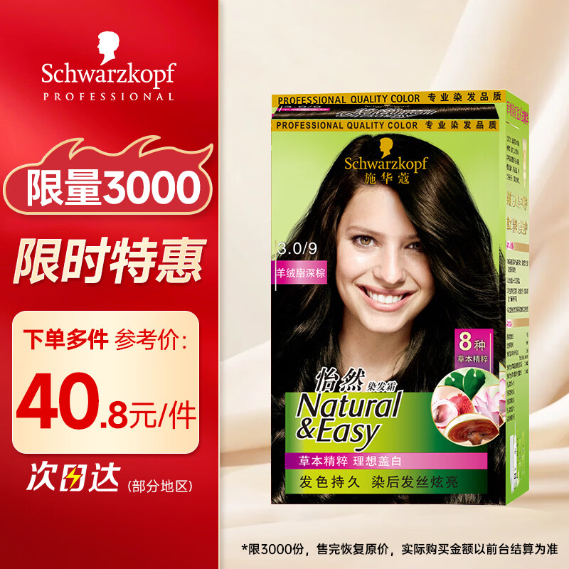 自营施华蔻怡然植物染发霜3.0/9羊绒脂深棕(染发剂染发膏盖白)染发剂