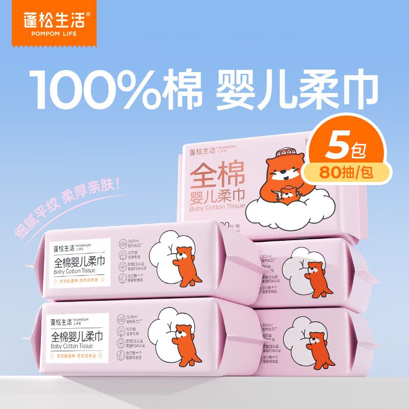 蓬松生活一次性全棉婴儿棉柔巾干湿两用宝宝洗脸巾 柔软洁面亲肤100%纯棉 【100%棉】80抽*5包