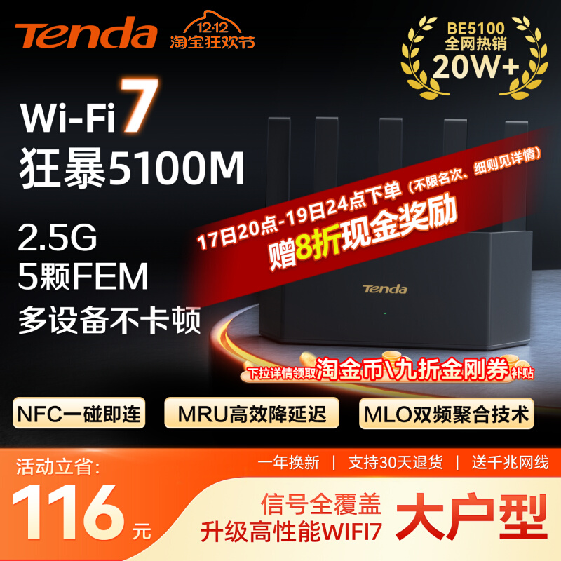 Tenda腾达路由器WiFi7云霄BE5100【顺丰极速发】家用高速千兆穿墙王无线2.5G口5G双频mesh新款