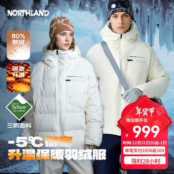 诺诗兰(NORTHLAND)冬季新款户外鹅绒羽绒服男女可升温连帽三防抗寒保暖面包服 极地白色 175cm (120-140斤 卡码拍小)