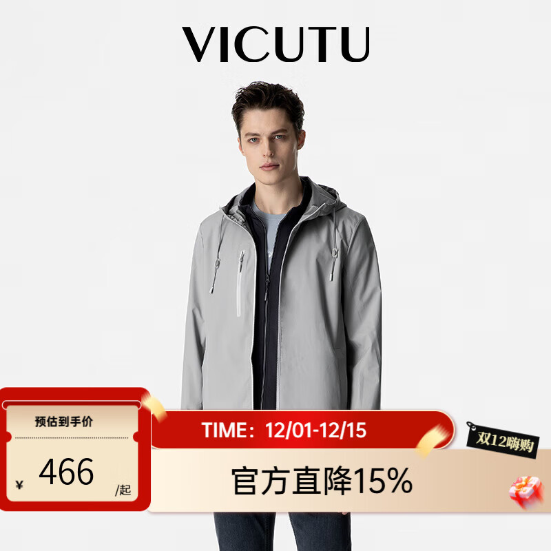 威可多(VICUTU)男士春秋款百搭风衣抽绳连帽商务休闲男装时尚外套 浅灰 XL