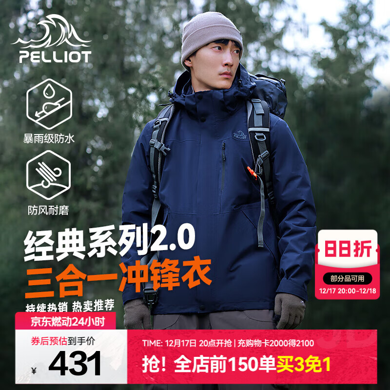 伯希和(Pelliot)【经典2.0山野】冲锋衣三合一男女秋冬户外防水防风保暖外套夹克 【男款】藏蓝色 | 两件套/四季款 XL 女 126-135斤 男153-169