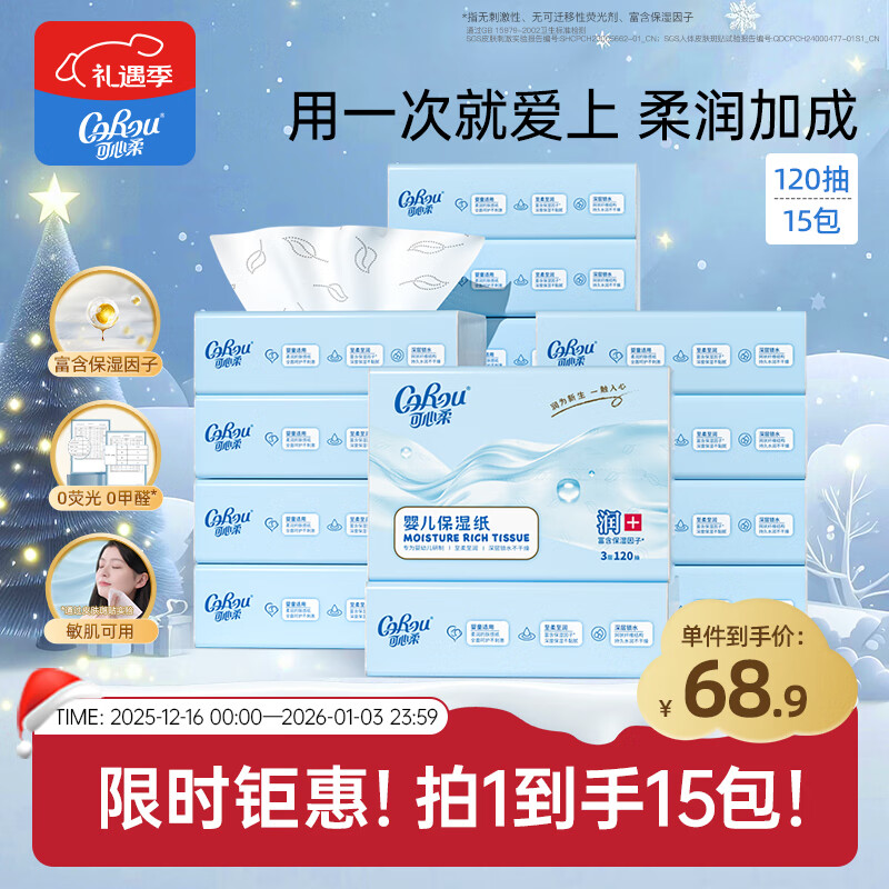 可心柔(COROU)抽纸 婴儿纸巾 3层S码120抽15包 保湿纸巾 云柔巾 乳霜纸 整箱