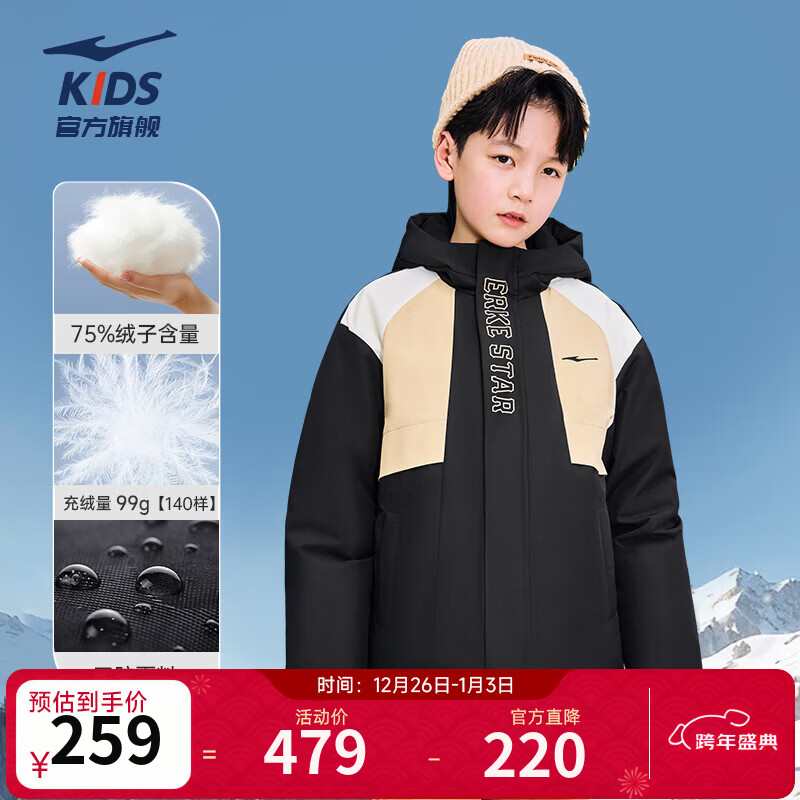 鸿星尔克童装儿童羽绒服男童女童羽绒服新年款拜年简约保暖羽绒外套 正黑-绒子含量75% 160 充绒量125g