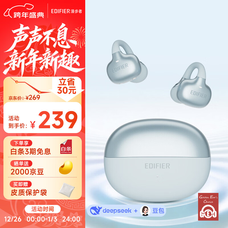 漫步者(EDIFIER)【2025年新款】X Clip耳夹式蓝牙耳机 AI翻译 开放式 跑步运动耳机 蓝牙6.0 冰川蓝