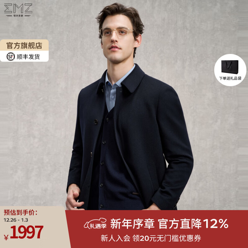 EMZ鄂尔多斯【可脱卸鹅绒内胆】冬季羊毛羊绒商务毛呢加厚大衣外套男 藏青 S 165/88A
