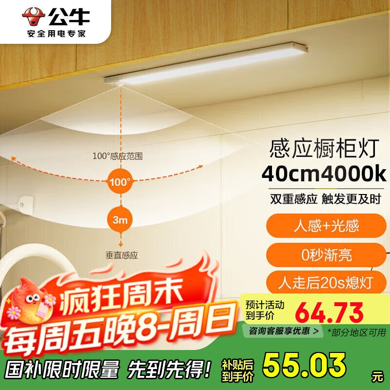 公牛(BULL)感应橱柜灯衣柜灯LED人感光感磁吸 卧室床沿玄关小夜灯40CM4000K