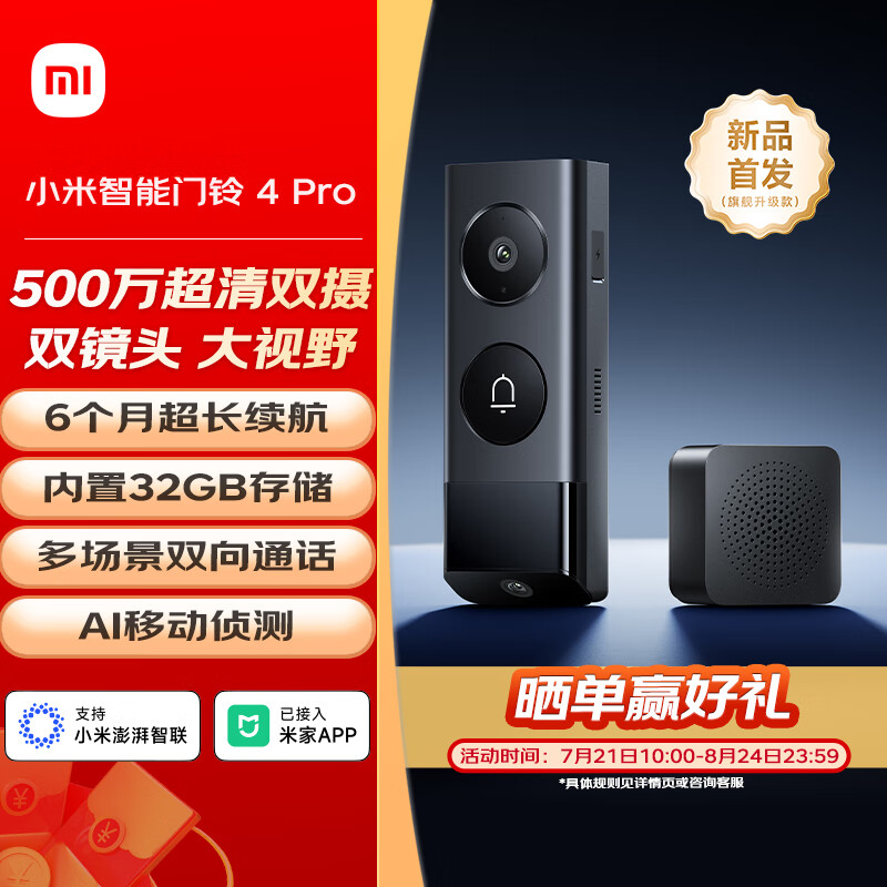小米 小米智能门铃4 Pro 500万+200万超清150°大视野 猫眼摄像头门前异动通知手机查看远程实时查看