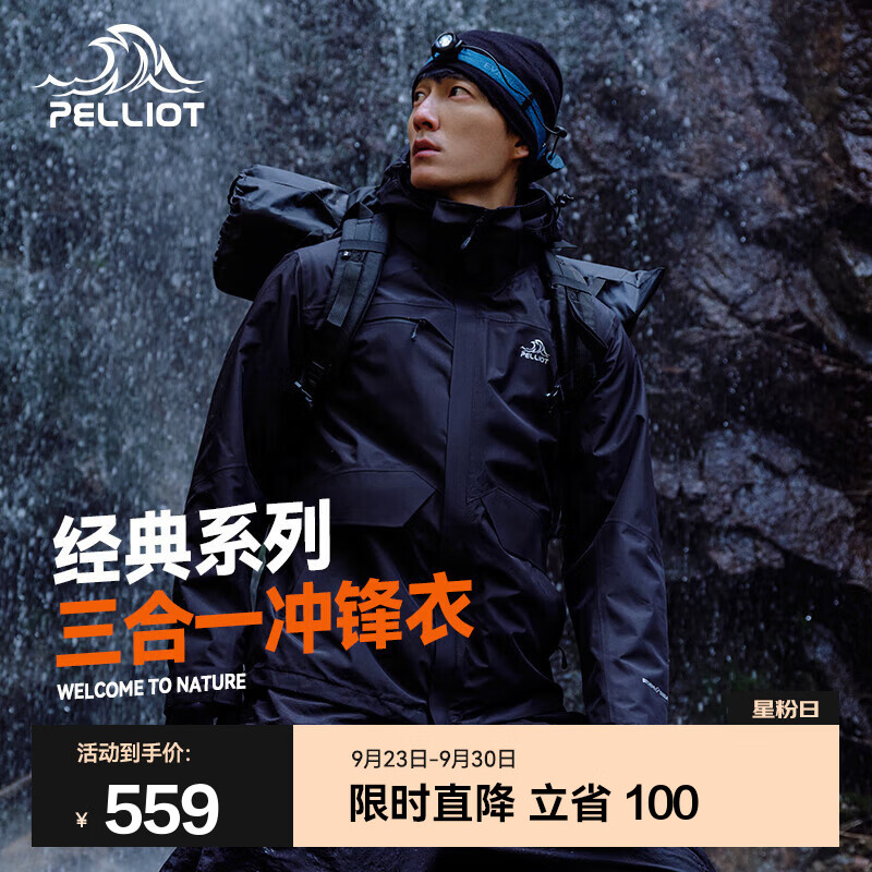 伯希和(Pelliot)冲锋衣三合一男女薄外套春秋抓绒内胆夹克户外防风防泼水登山服 【男】曜石黑 S