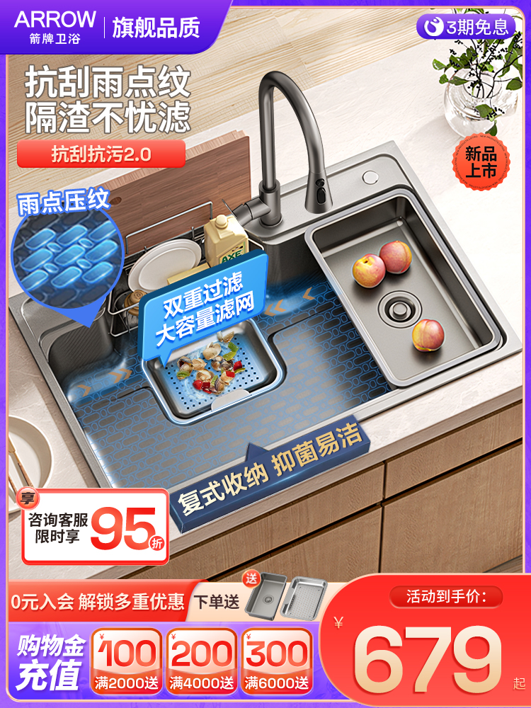 箭牌聚渣宝洗菜盆大单槽厨房水槽304不锈钢家用日式台下盆洗碗池