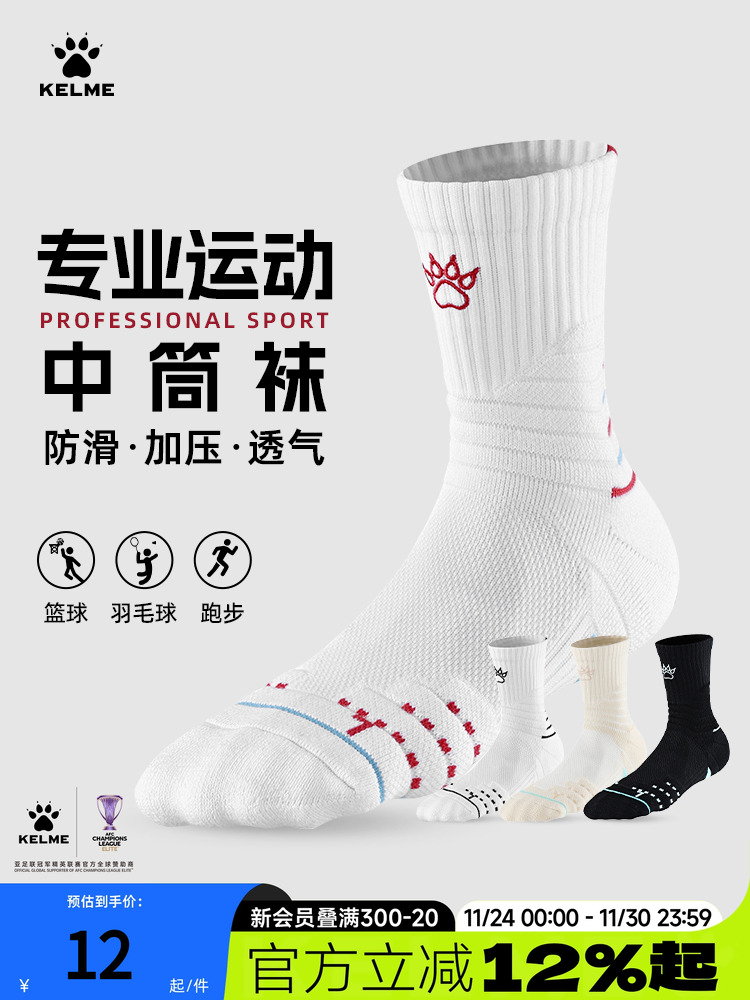 卡尔美足球旗舰店运动袜男中筒防滑袜子专业篮球袜青少年跑步短袜
