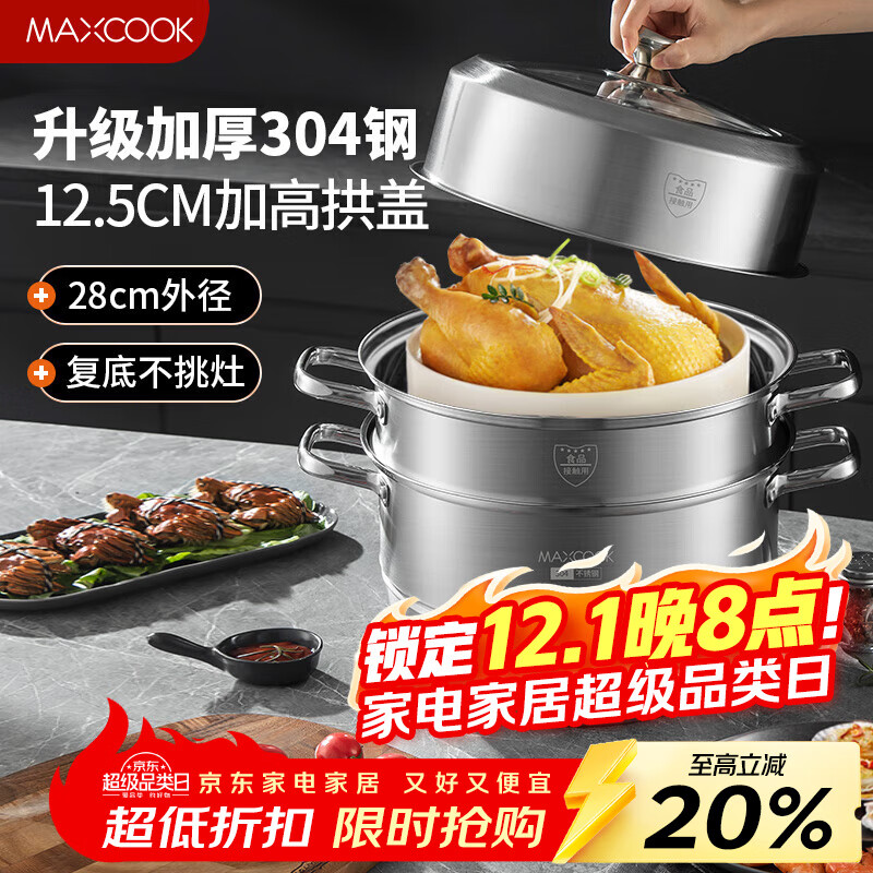 美厨(maxcook)蒸锅 304不锈钢28cm二层蒸锅 加厚复底汤锅 燃气电磁炉通用MCZ828