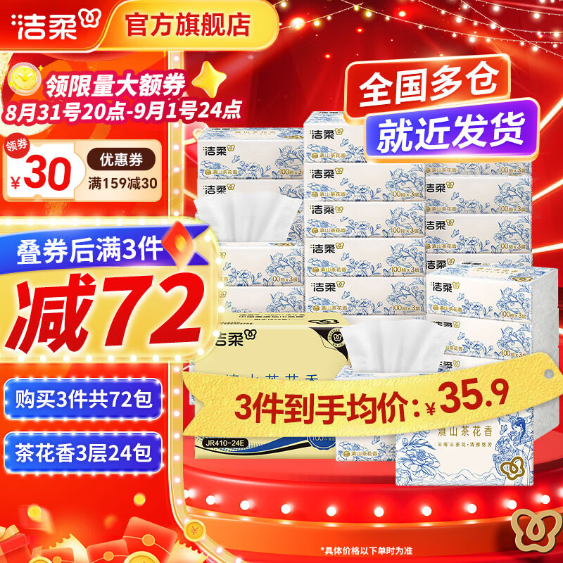 洁柔抽纸滇山茶花香软抽可湿水面巾纸擦手纸卫生有香型抽纸家用 3层 100抽*24包 整箱装