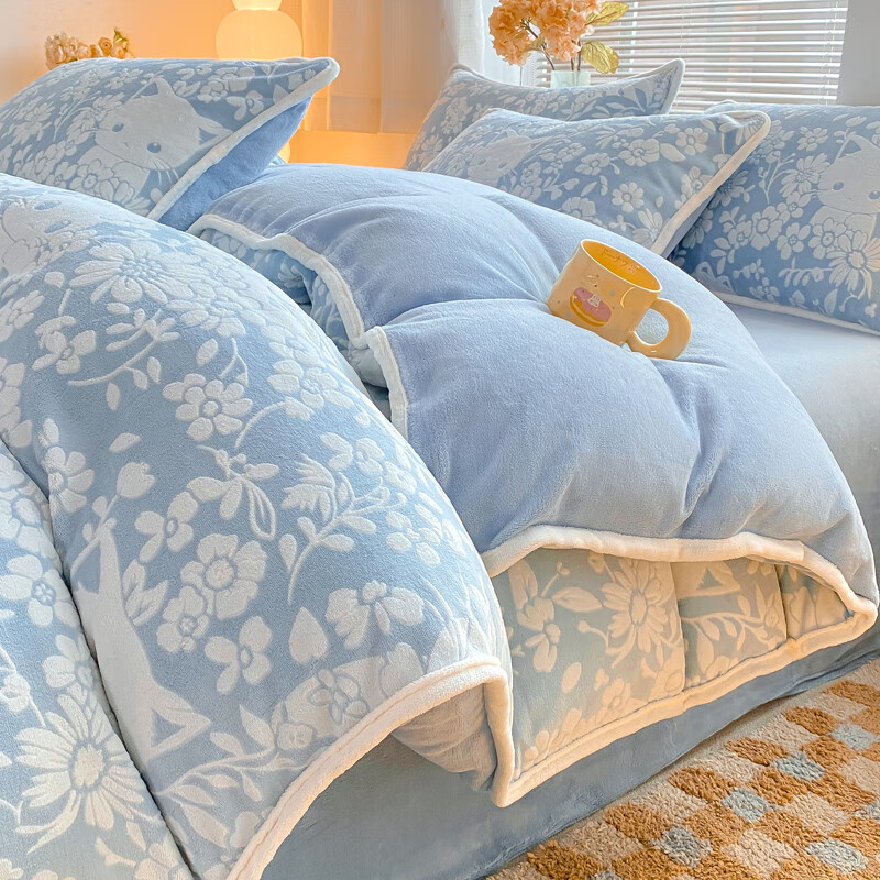 Krupp Corp 加厚滚边雕花牛奶绒四件套 床笠亲肤绒冬季保暖加密型绒套件 半夏时光-兰-MF 床单款1.8米床(被套200*230cm)