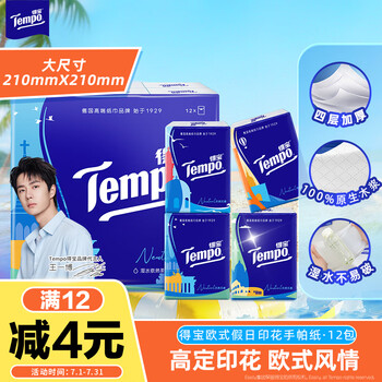得宝(TEMPO)一博同款 手帕纸 欧式印花7张*12包 4层湿水不破 纸巾小包 面巾纸
