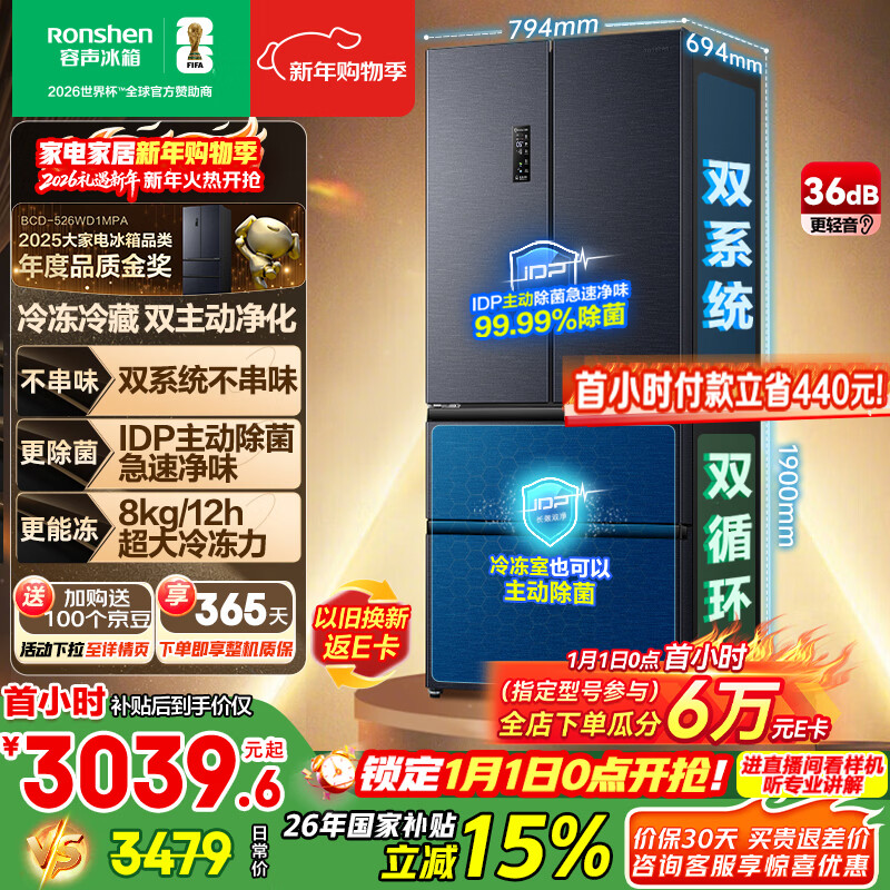 容声双净526L法式多门冰箱双系统双循环大容量一级能效风冷无霜变频四开门灰BCD-526WD1MPA国家补贴