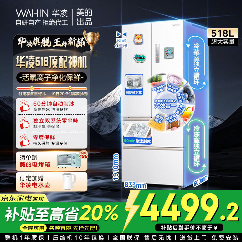 美的出品华凌 60cm薄零嵌入法式多门冷藏冷冻双净味家用风冷冰箱HR-518WUFIPZ