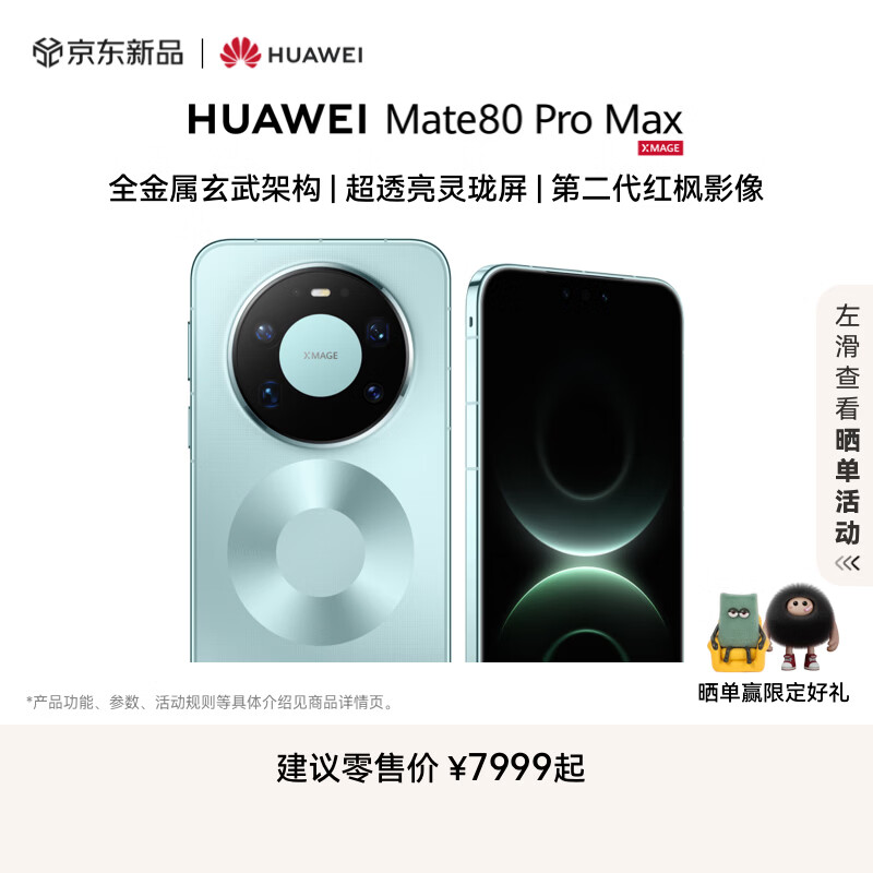 HUAWEI Mate 80 Pro Max 麒麟9030 Pro 全金属玄武架构 超透亮灵珑屏 华为直屏鸿蒙智能手机 极光青 16GB+512GB