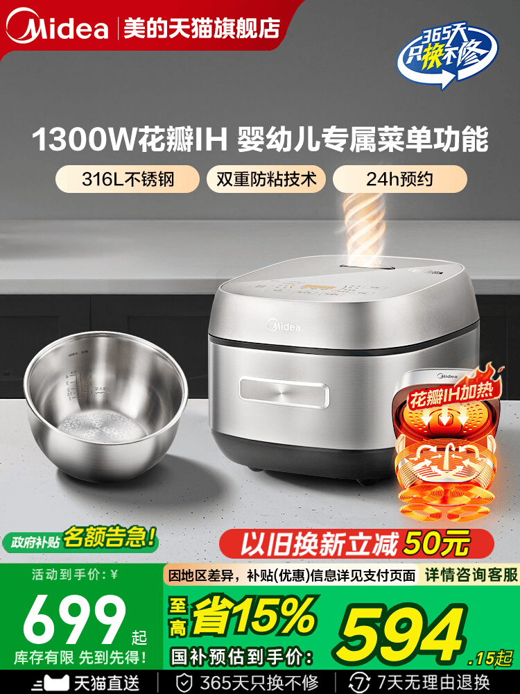 美的电饭煲无涂层电饭锅0涂层316L不锈钢内胆IH抗粘4升官方旗舰店