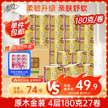 清风【李昀锐同款】有芯卷纸原木金装 4层加厚180克*27卷 卫生纸 整箱