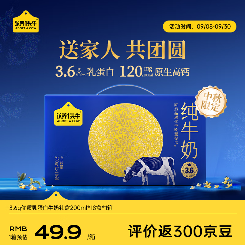 认养一头牛【牛奶中秋礼盒】3.6g蛋白高钙纯牛奶200ml*18盒京东自营老人送礼