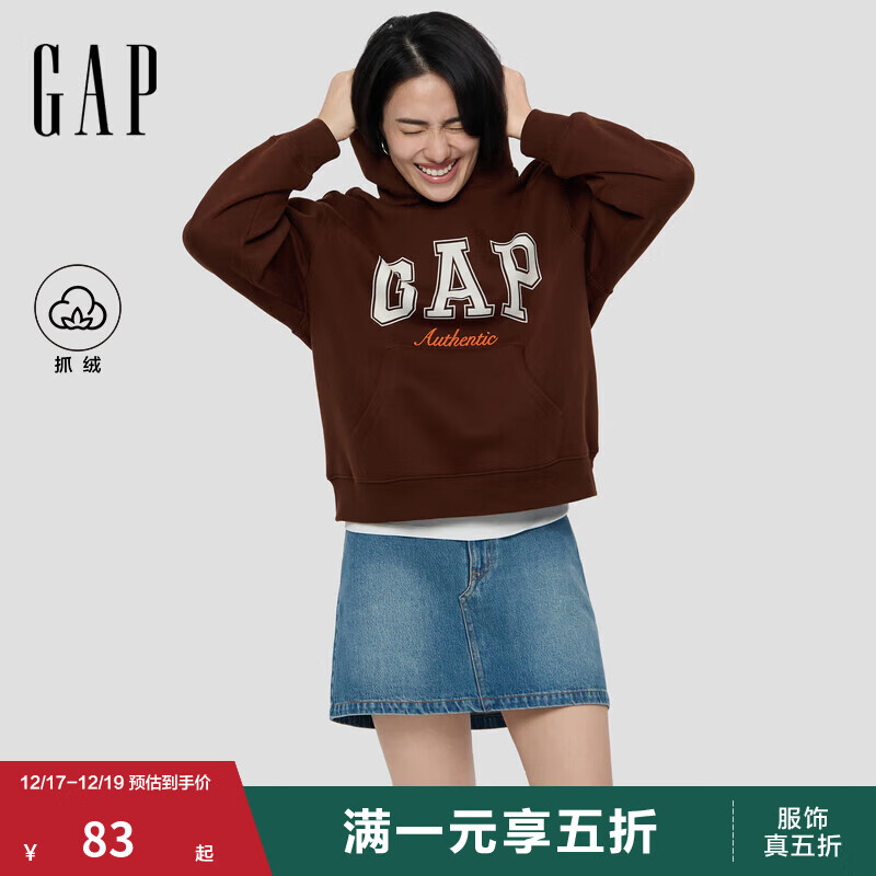 GAP女装2025秋季新款撞色Logo宽松抓绒套头连帽衫卫衣上衣 棕色 S (160/84A) 亚洲尺码