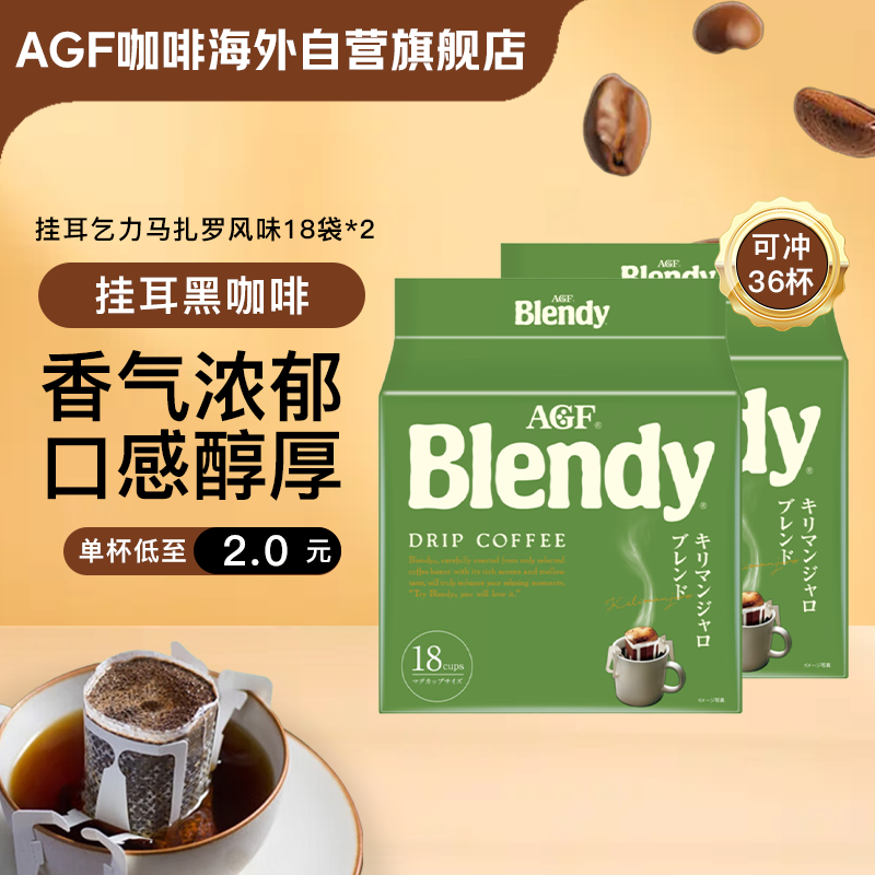 AGF挂耳咖啡乞力马扎罗风味7g*18袋*2包 Blendy滤挂式现磨手冲
