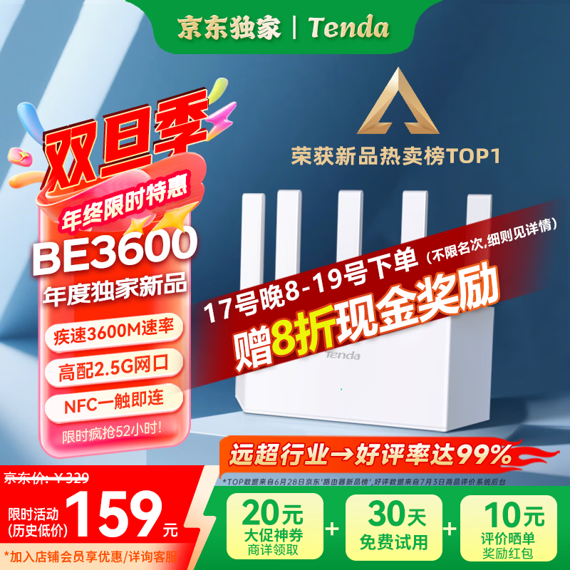 Tenda腾达路由器WiFi7【京东独家】无线千兆穿墙王信号增强家用全屋2.5g网口云霄BE3600放大器立式