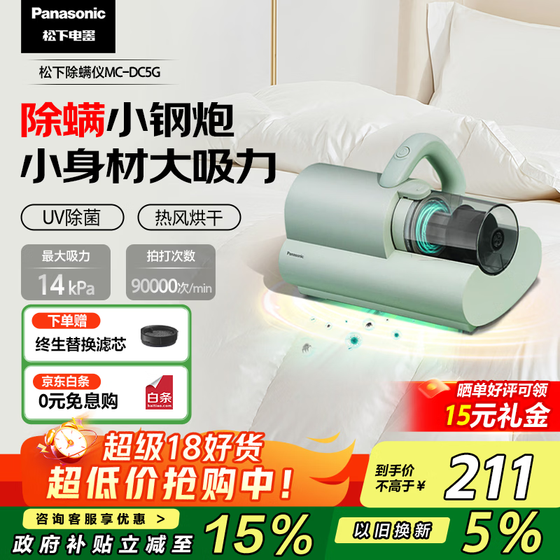 松下(Panasonic)【国家补贴】除螨仪床宝吸猫毛除螨虫一体机床上吸尘器大吸力紫外线杀菌热烘除湿团购礼品MC-DC5G