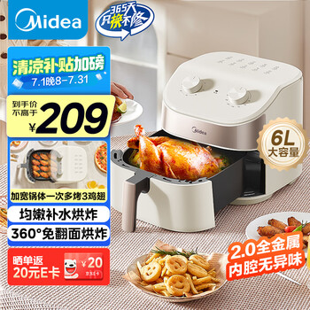 美的(Midea)不用翻面空气炸锅 宽口实用大容量 蒸汽嫩烤厨房家用 易用旋钮控时温 金属内腔无异味 6L KZE6017