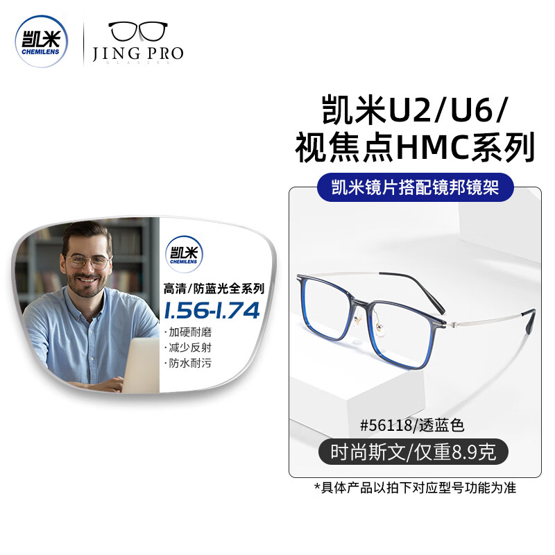 镜邦眼镜近视男女超轻眼镜框可配度数散光镜片TK1 56118透明蓝 配1.67凯米U2高清镜片