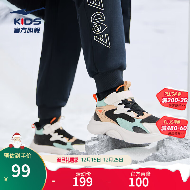 鸿星尔克男童鞋女童棉鞋冬季大童小童加棉休闲鞋儿童运动鞋丨川尘2 正黑/微晶白/天青色 -偏小1码 32