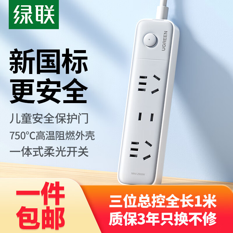 绿联插排/插座/插线板/排插/插板/拖线板/接线板新国标大间距宿舍家用一件包邮3位总控全长1米 15670