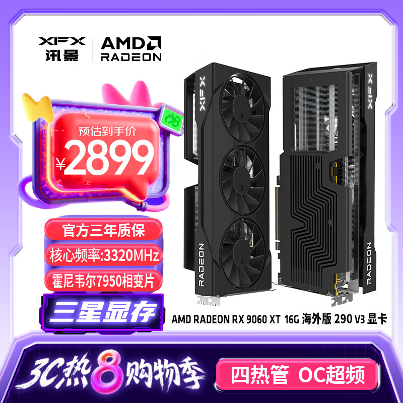 讯景(XFX)AMD RADEON RX 9060 XT 海外版290 V3 16GB 三星显存 全新电竞游戏设计智能学习台式电脑独立显卡