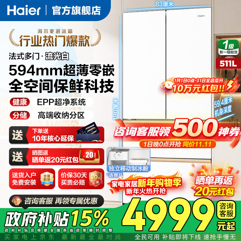 海尔(Haier)冰箱510/511升麦浪系列法式多门【重磅新品】594mm超薄零嵌全空间保鲜一级能效EPP超净国家补贴 511升+594超薄零嵌+EPP超净系统+流光白