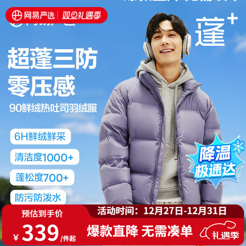 网易严选【断码清仓】热吐司pro三防超蓬零压加厚90白鸭绒鲜绒面包 螺甸紫-立领纯色 M