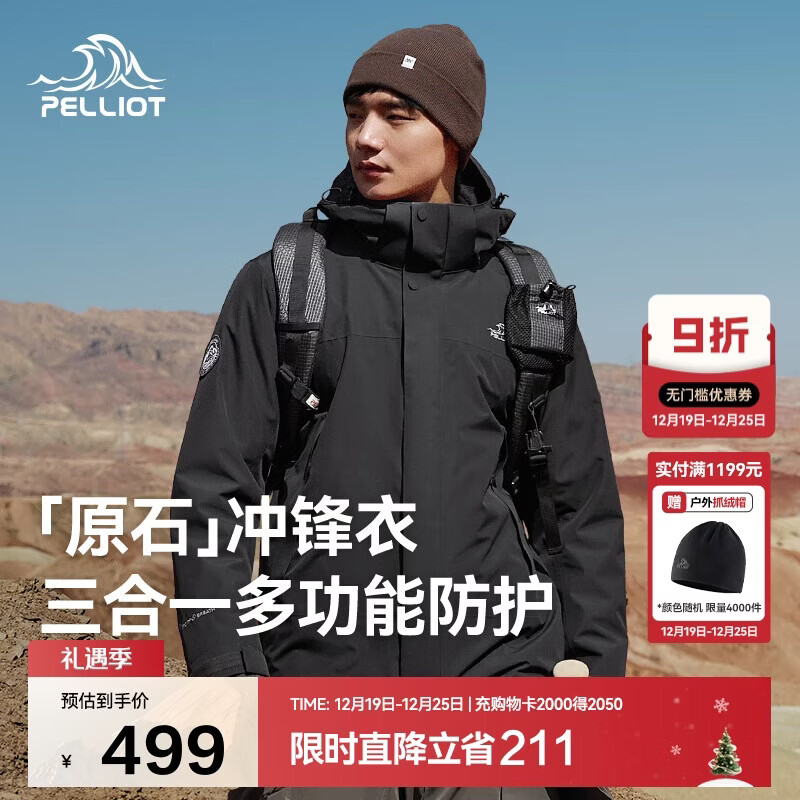 伯希和(Pelliot)[成毅同款]原石冲锋衣三合一男女秋冬户外保暖外套114301029黑XL