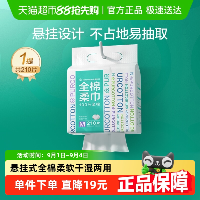 全棉时代一次性洗脸巾悬挂式纯棉柔巾M码干湿两用擦脸巾210抽*1包